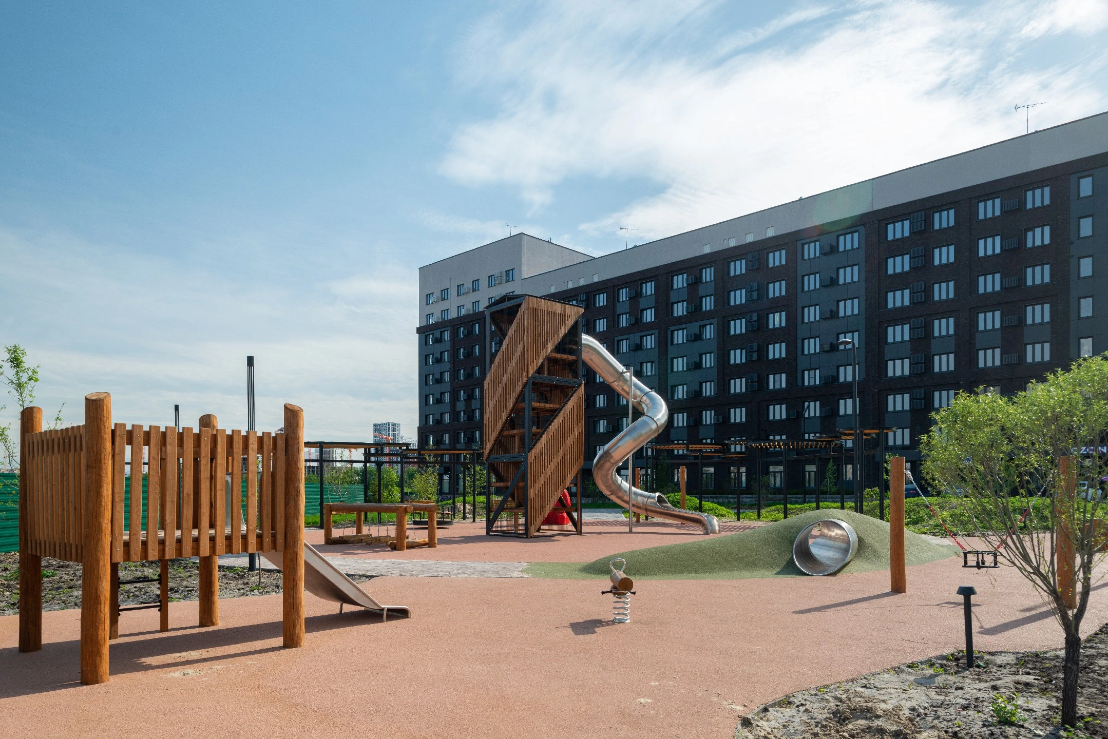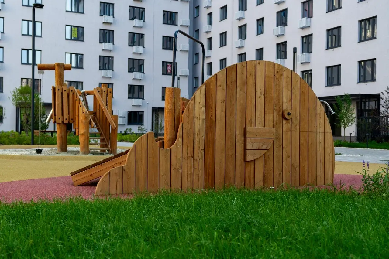 Для детей спроектировали игровые комплексы из натуральных материалов. Они устойчивы к морозам и влаге, поэтому служат долго и выглядят эстетично.