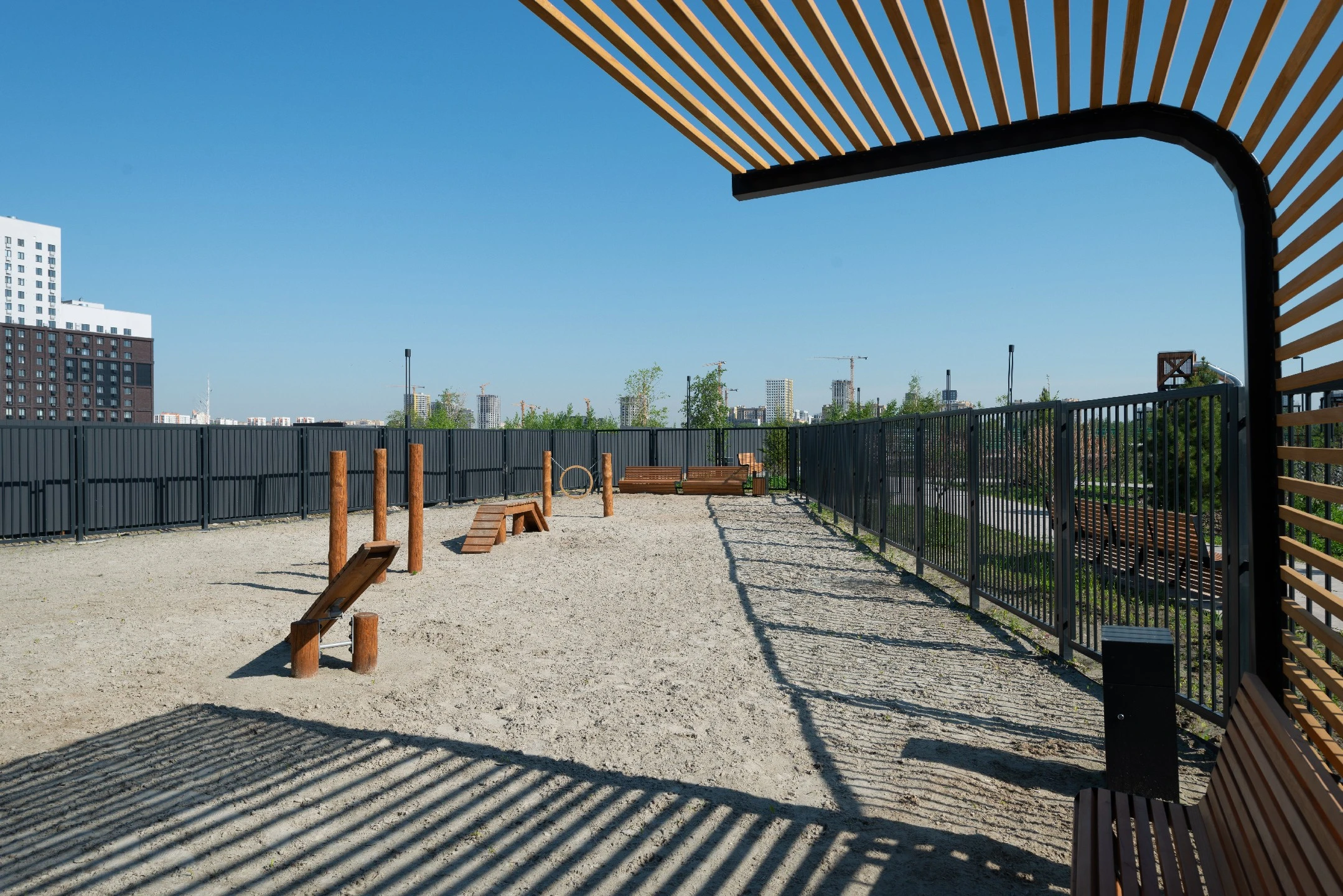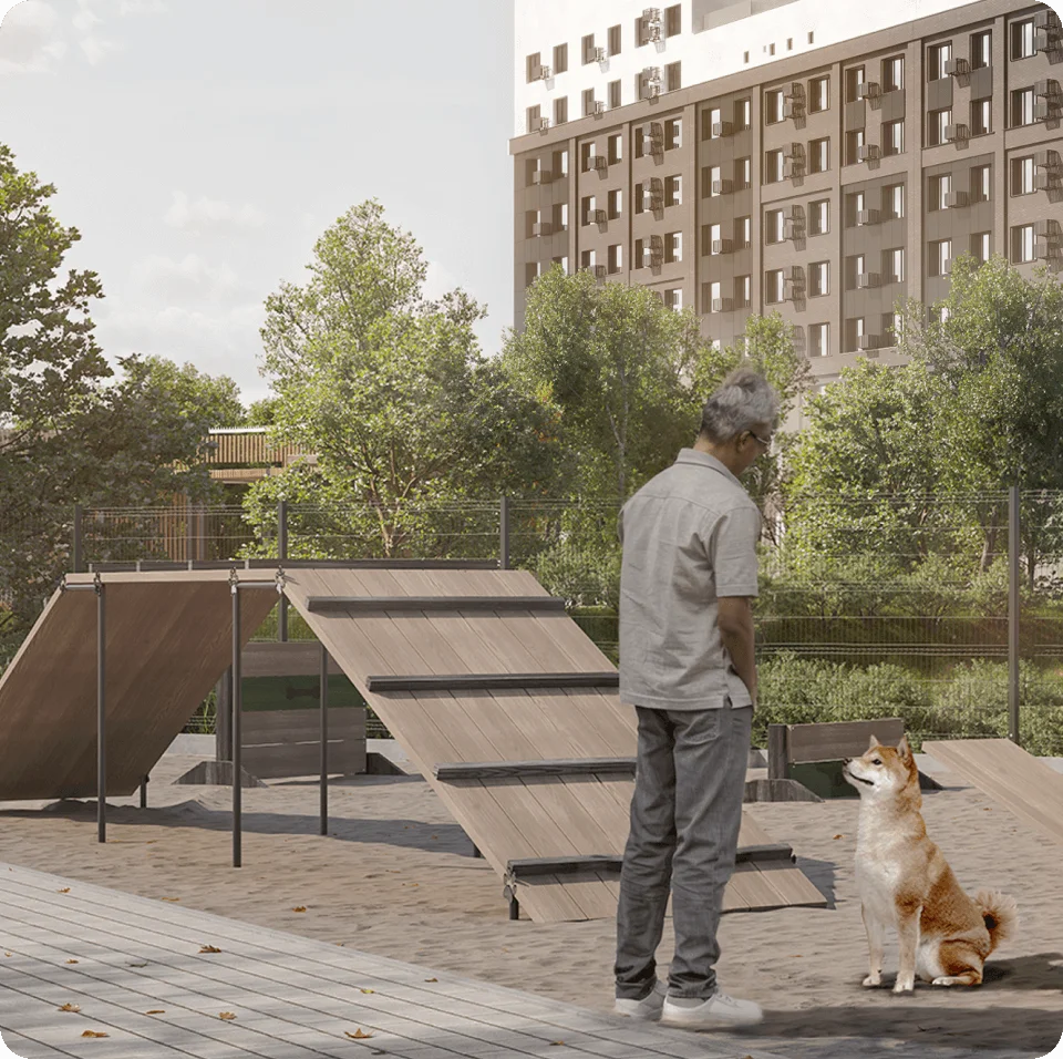 Здесь установлены тренажёры для развития ловкости и обучения новым командам, чтобы прогулки с питомцем проходили интереснее и с пользой.